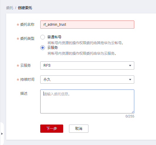 - 单击步骤2界面中的“创建委托”按钮,在委托名称中输入“rf_admin_trust”,委托类型选择“云服务”,选择“RFS”,单击“下一步”。