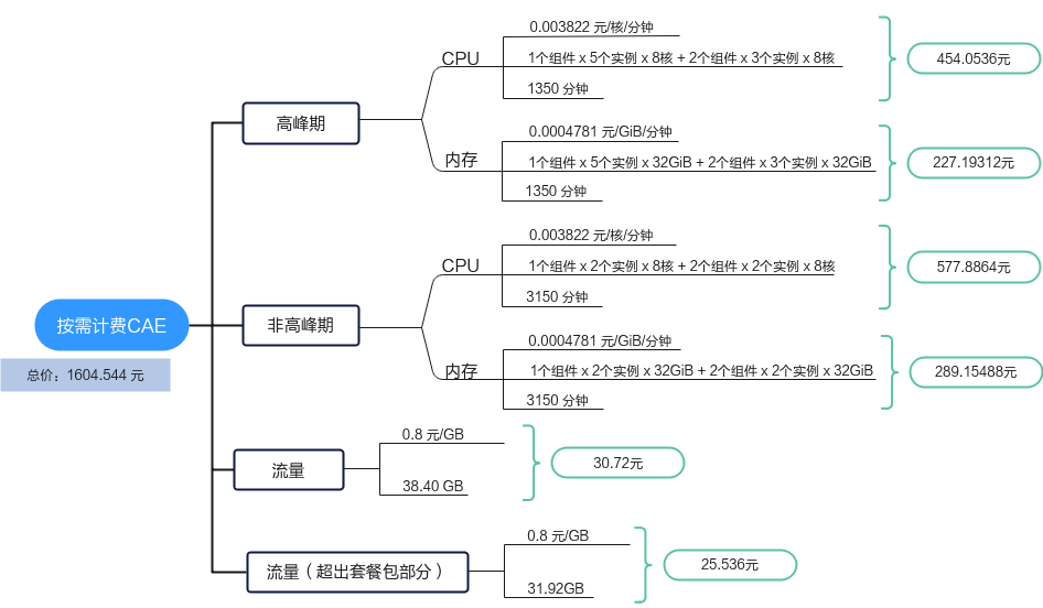 - 该计费示例中的CPU和内存的实例规格15k核30kGiB,超出了起步规格,实例规格按照两部分来计费: