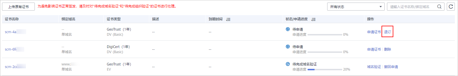 - 在需要退订的证书所在行的“操作”列中,单击“退订”,如图1所示。