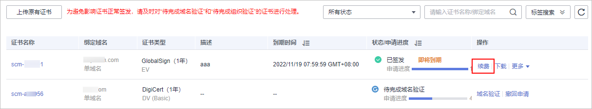 - 在需要续费的证书所在行的“操作”列中,单击“续费”,如图 续费所示。