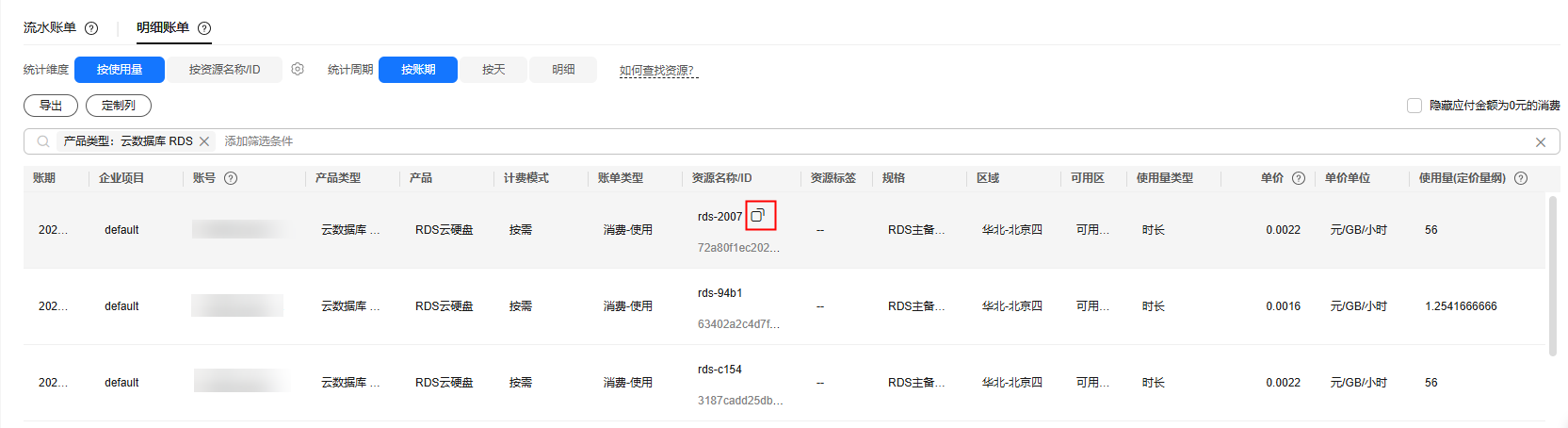 - 选择“流水和明细账单 > 明细账单”,在如下图所示位置单击鼠标左键,复制资源名称。
