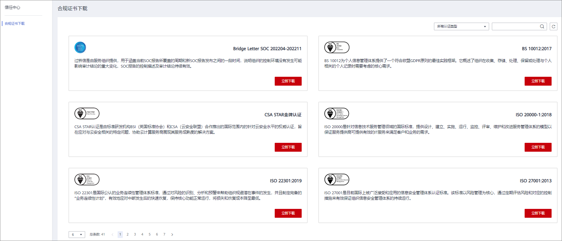 华为云服务及平台通过了多项国内外权威机构(ISO/SOC/PCI等)的安全合规认证,用户可自行申请下载合规资质证书。