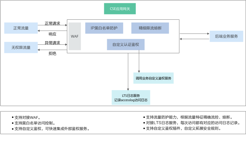 CSE应用网关提供SSL证书卸载、自定义鉴权等多种认证鉴权方式,负责各个方向流量调度及安全防护与服务治理。