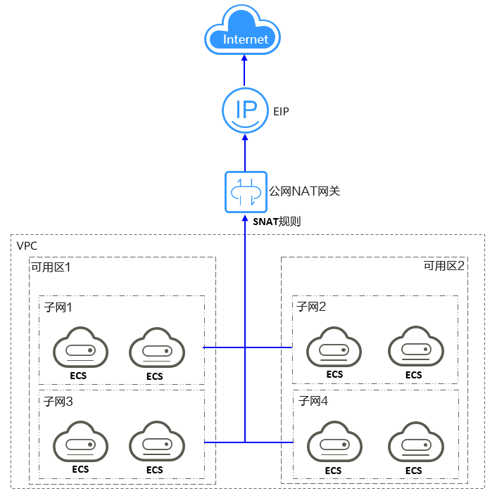 - SNAT功能通过绑定中转IP,可实现VPC内跨可用区的多个云主机共享中转IP,访问外部数据中心或其他VPC。