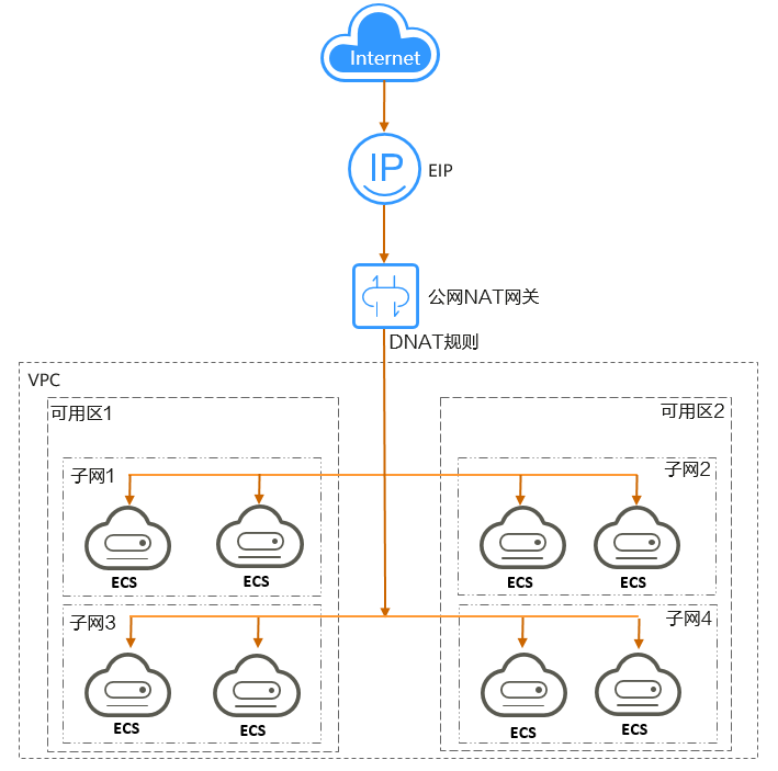 - DNAT功能通过绑定中转IP,可实现IP映射或端口映射,使VPC内跨可用区的多个云主机共享中转IP,为外部私网提供服务。