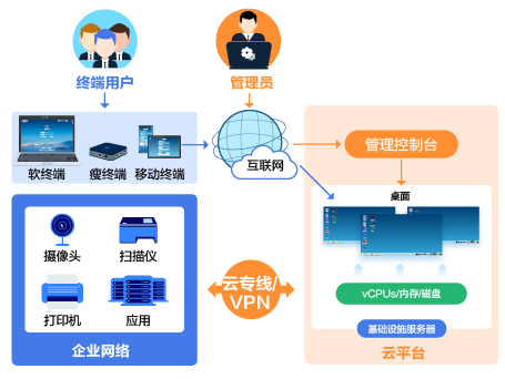 终端用户通过终端设备登录由管理员在云平台的管理控制台中购买的桌面,实现办公需求。并且可以通过云专线/VPN的方式使用存储于企业网络中的网络应用。云桌面的基本原理,如图1所示。