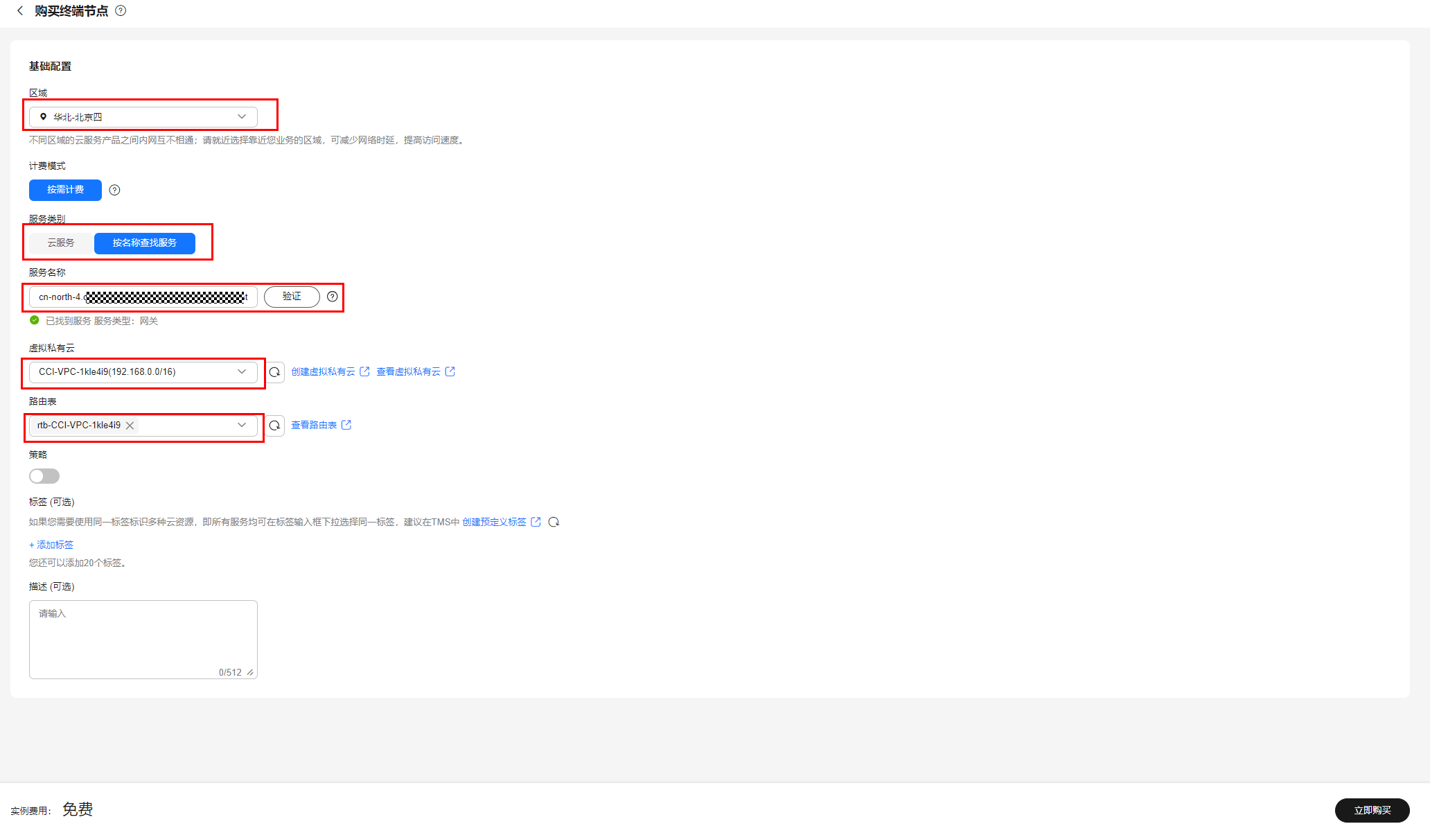 - “虚拟私有云”选择步骤二:创建命名空间配置的虚拟私有云。当创建连接“网关”类型终端节点服务的终端节点时,会出现“路由表”,建议选择所有路由表,否则可能导致网络无法访问。