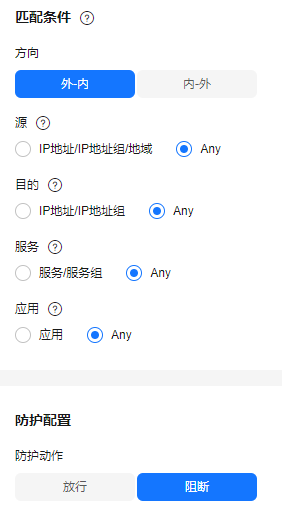 本示例中仅解释必要参数,其他参数配置请参见通过添加防护规则拦截/放行流量。