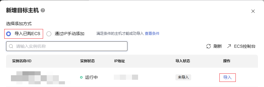 - 待页面提示新建主机集群成功,在“目标主机”页签中单击“添加或导入主机”,选择添加方式“导入已购ECS”,在列表中找到准备工作中购买的ECS,单击“导入”。