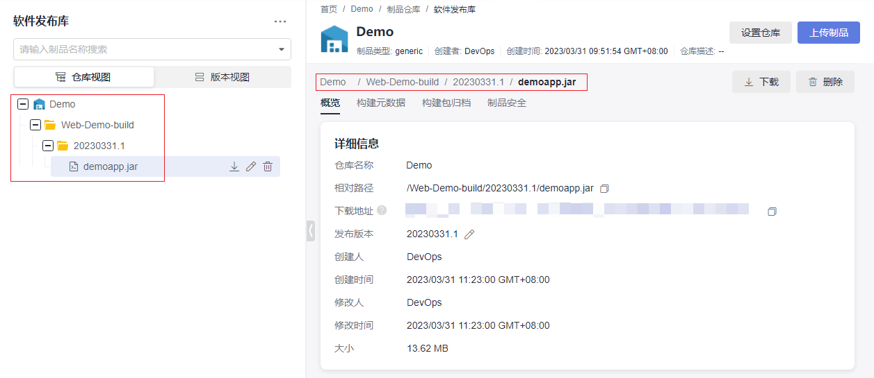 在“仓库视图”中找到与项目名称同名的仓库,依次进入文件夹“Web-Demo-build > 3中记录构建编号”,即可找到生成的软件包“demoapp.jar”。