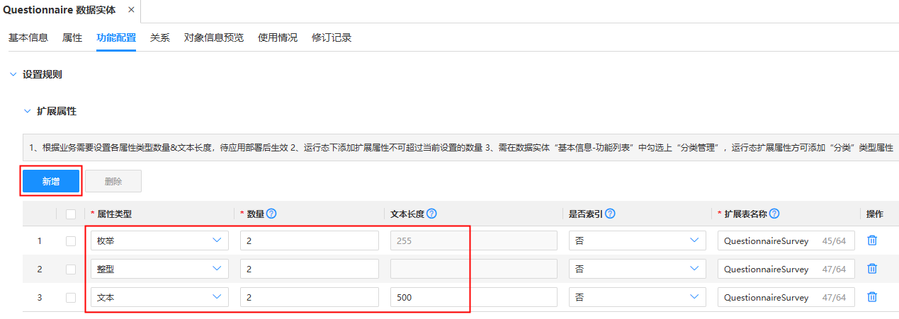 在“扩展属性”栏中,单击“新增”,新增如下扩展属性类型。