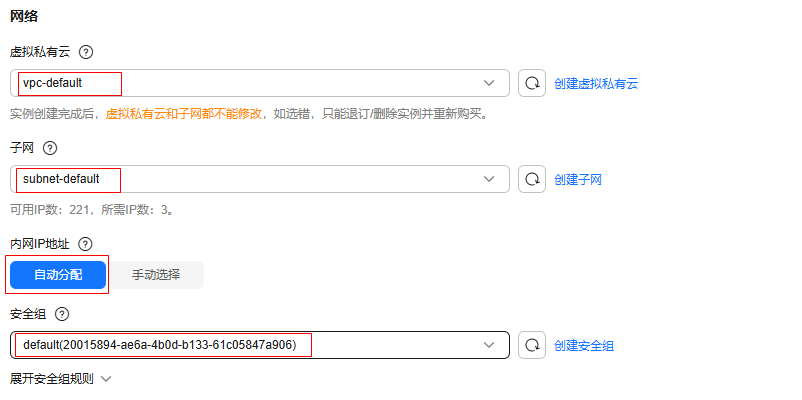- 设置实例网络环境信息,如图4所示,配置详情请参考表4。