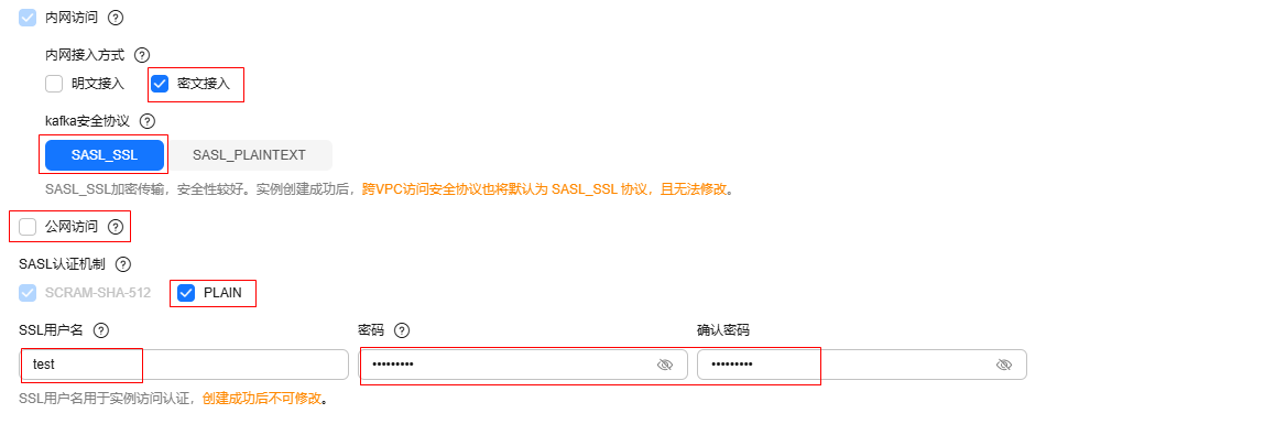 选择“密文接入”,即客户端连接Kafka实例时,需要进行SASL认证。