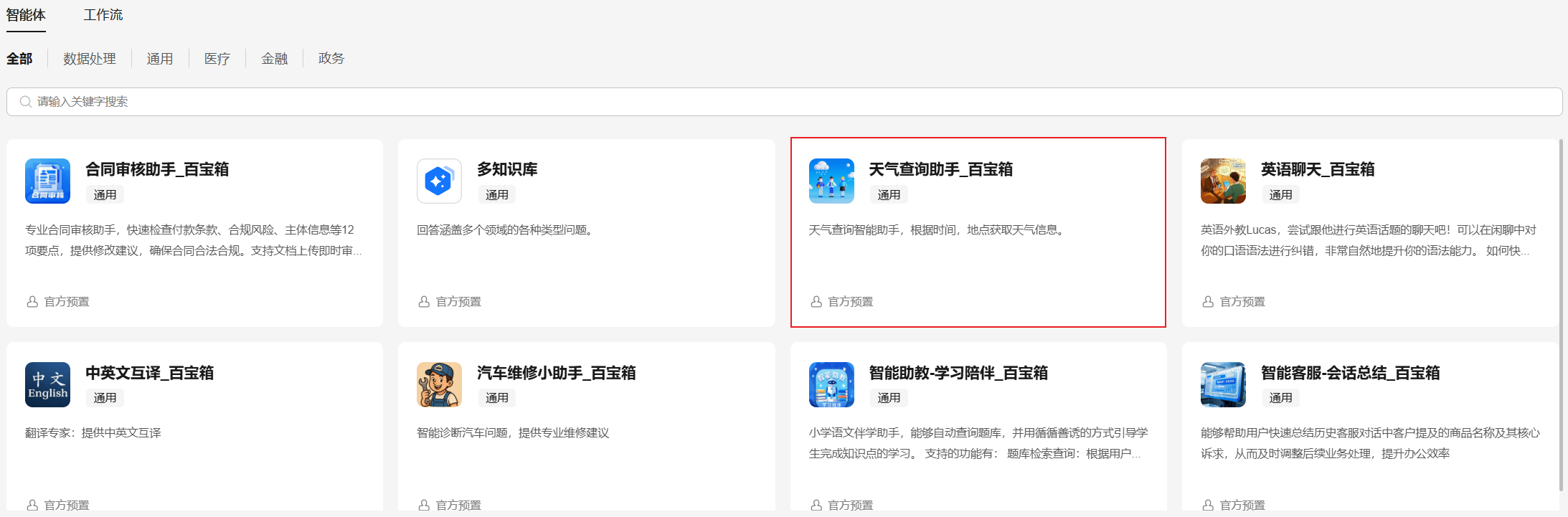 - 在应用广场主界面单击“智能体”页签,找到“天气查询助手”智能体,如图3所示。