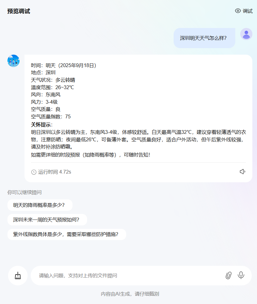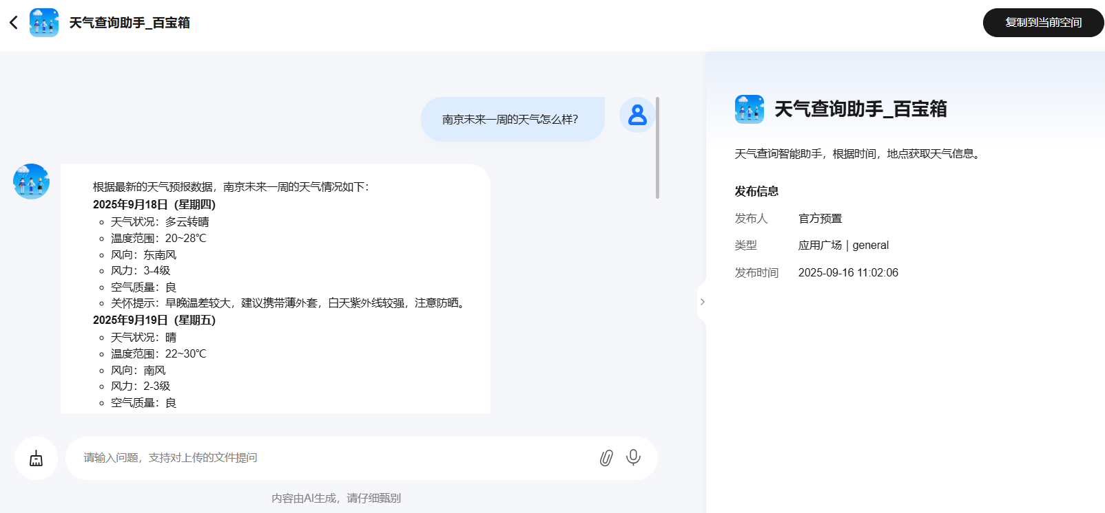 - 单击“天气查询助手”应用,在智能体应用主界面,您可以在对话框中输入描述。例如:“南京未来一周的天气怎么样?”,体验该智能体功能是否符合您的需求。