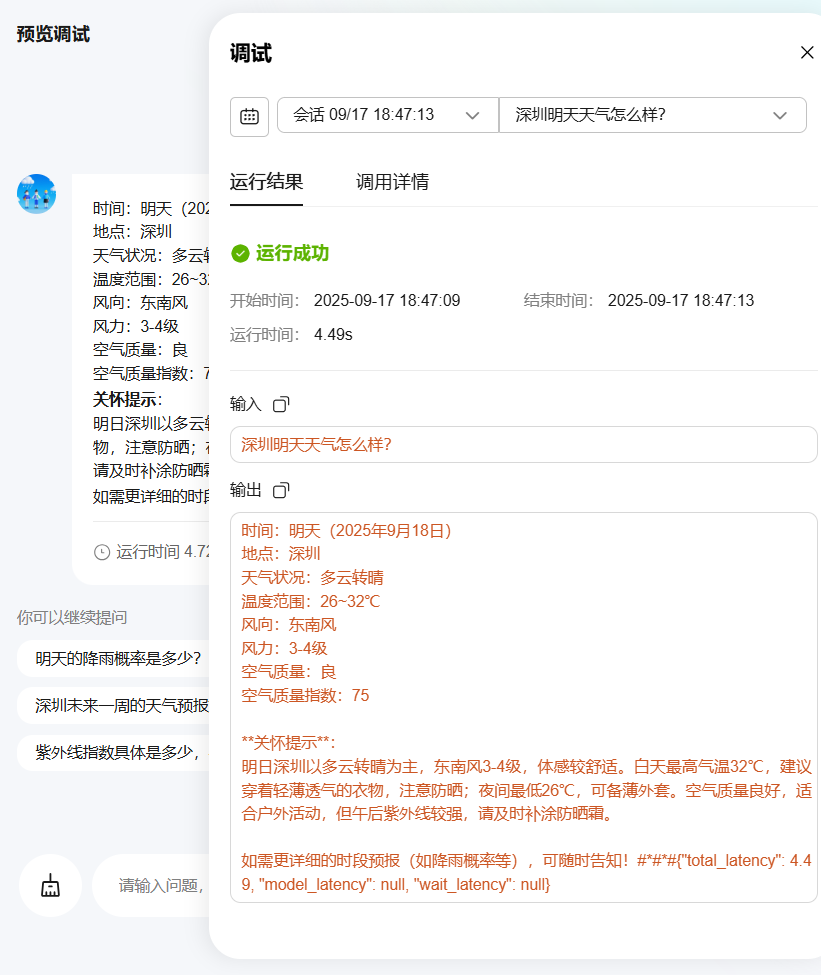 图6 调试智能体 - 在调试过程中,单击右上角“调试”,可以查看当前会话的运行结果与调用详情。