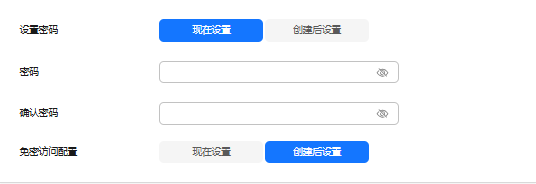 配置免密的网段,连接实例时,可以免输入实例密码,支持“创建后设置”和“现在设置”两种方式。