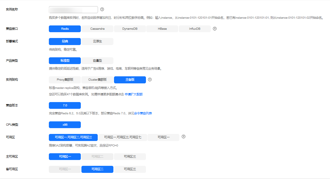 - 如果业务需要较高的容灾能力,请选择3可用区,此时实例下的节点根据您的需要选择主可用区和备可用区。