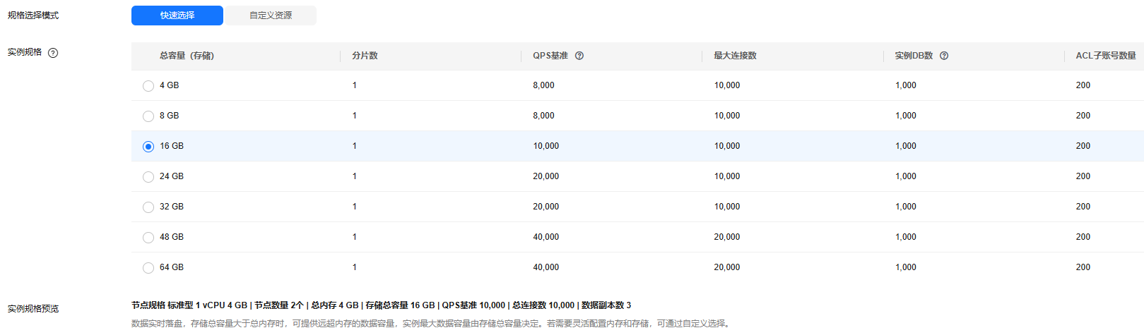 选择实例规格后,自动生成实例总容量、节点规格、节点数量、QPS基准、总连接数、数据副本数信息,方便用户知晓已选择的实例规格。