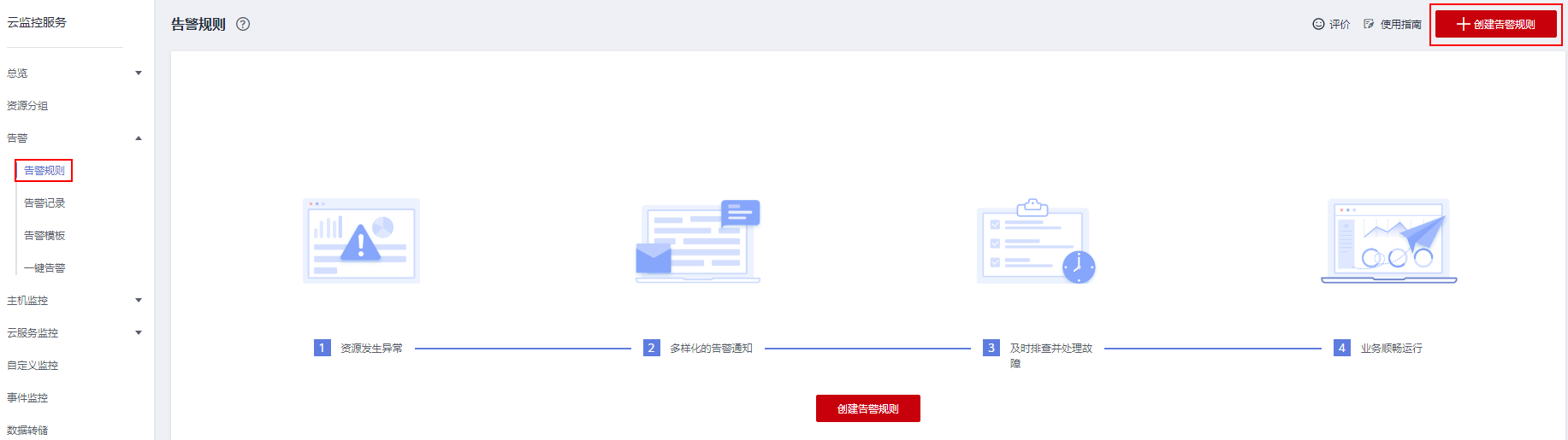 告警规则创建完成后,当监控指标触发设定的告警策略时,云监控服务会在第一时间通过消息通知服务实时告知您云上资源异常,以免因此造成业务损失。