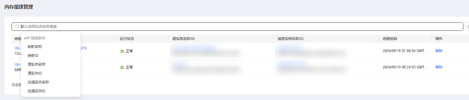 - 在左侧导航栏选择“内存加速管理”,可以在“内存加速管理”页面查看全部映射关系,也可以在通过搜索关键字(如映射名称、映射ID等),找到具体的映射。