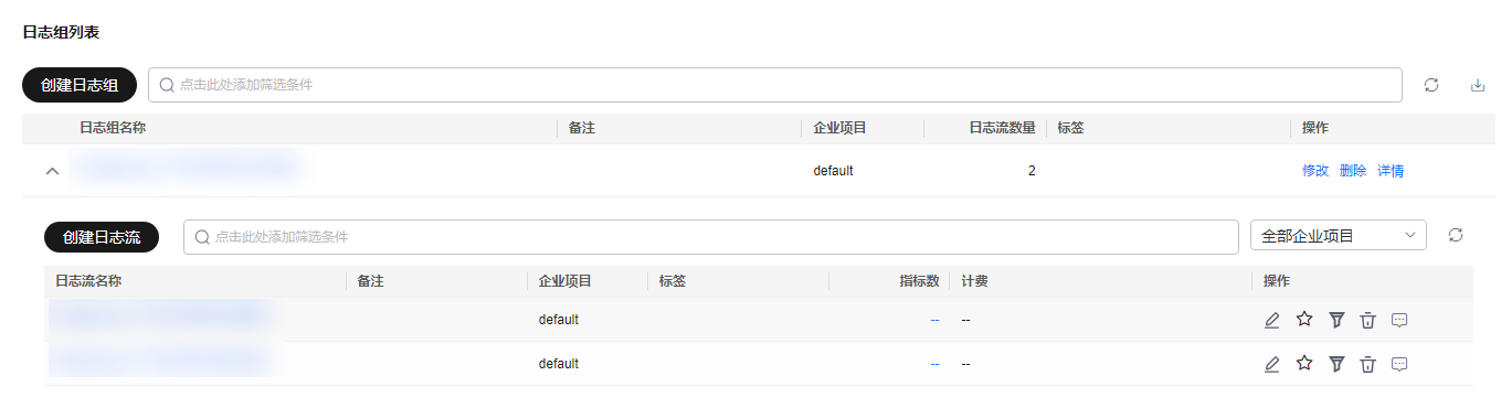 - 在“日志管理”页面的“日志组列表”中,选择日志组和日志流,单击选择的日志流,进入日志流页面。