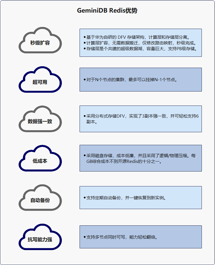GeminiDB Redis是华为云数据库团队自主研发且兼容Redis5.0协议的云原生数据库,采用计算存储分离架构。存储侧使用自研的存储系统,容量无限扩展、强一致、高可靠。计算侧基于 LSM 存储引擎实现,通过将大量的随机写转换为顺序写,从而极大地提升了数据写入性能,同时也通过读缓存、bloom filter 等极大优化了读取性能。下图是GeminiDB Redis在IM场景的优势介绍。