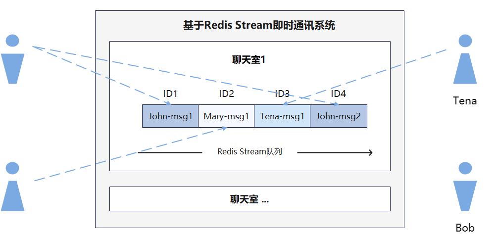 下图是基于GeminiDB Redis的IM系统模型图,使用stream作为基本数据结构。redis stream不仅可以作为消息存储容器,还实现了生产者、消费者等基本模型,具有IM系统的基本功能,如消息订阅,分发、增加消费者等,用户可基于GeminiDB Redis快速构建一套IM系统。创建一个群聊时,在redis中对应地为该群聊创建一个stream队列。在发送消息时,每个用户都将消息按照时间顺序添加到stream队列中,保证了消息的有序性。stream是一个持久化的队列,可保证信息不丢失。