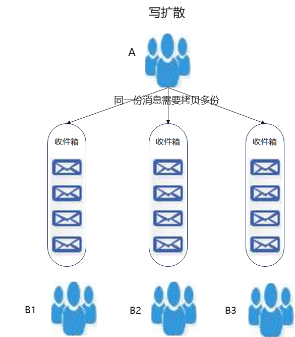 如上图所示,用户B与每个聊天的人(A1,A2,A3)都有一个信箱(一种数据结构的抽象,用于存储消息),B在查看聊天信息时需读取所有有新消息的信箱。IM系统里的读扩散通常是每两个相关联的人就有一个信箱。