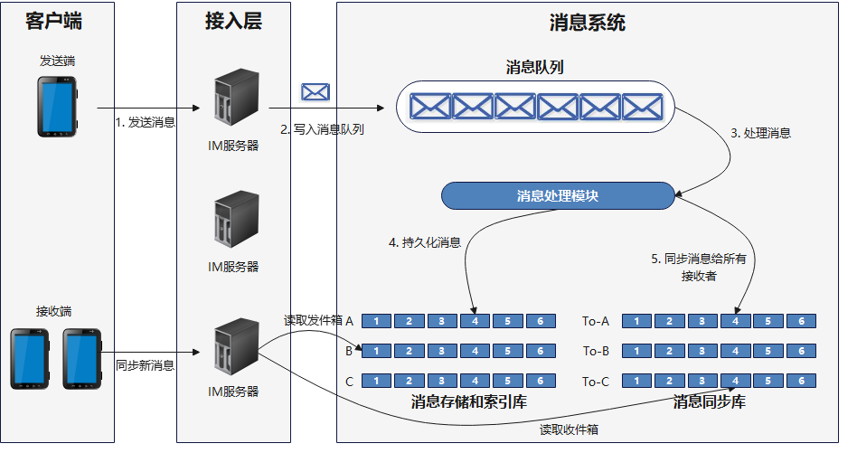 - 划分消息存储库与消息同步库。消息存储库用于全量保存所有会话消息,主要用于支持消息漫游。消息同步库,主要用于接收方的多端同步。