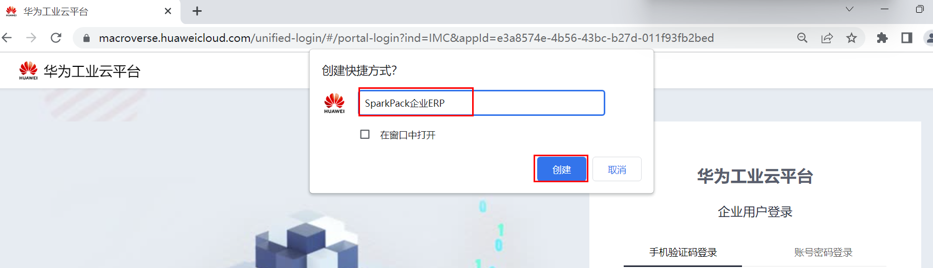 3)在弹出的窗口里,输入华为云成长型企业数字化转型包企业ERP,点击创建按钮。