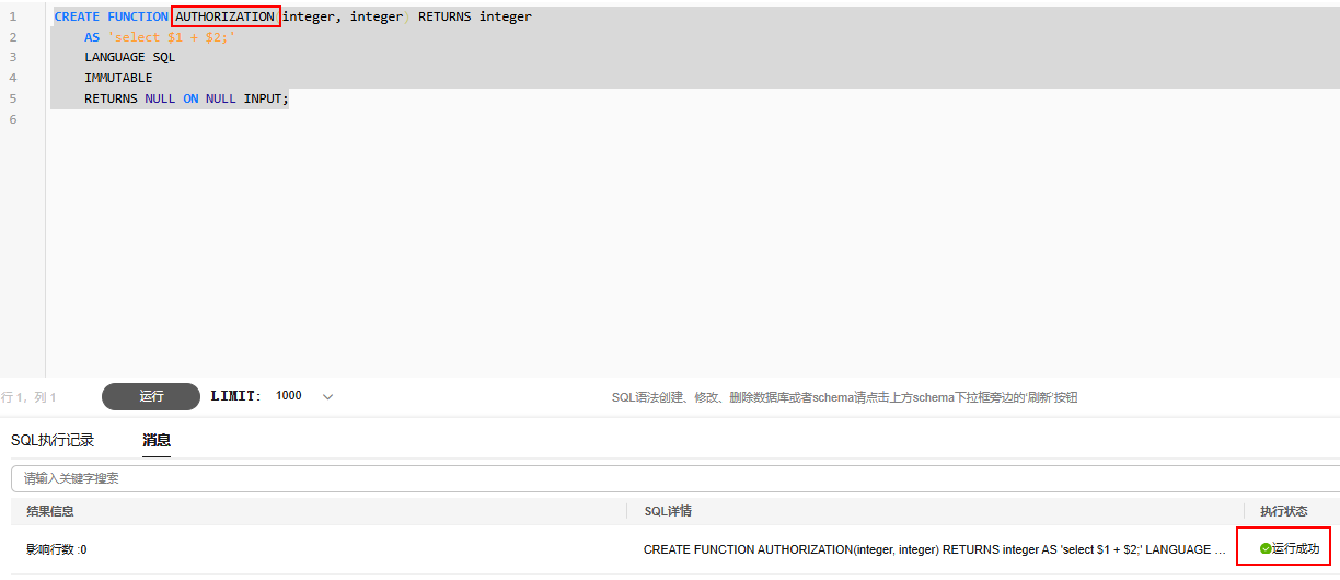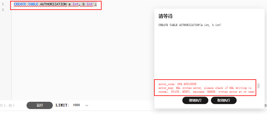 举例:“AUTHORIZATION”为保留关键字,当使用“AUTHORIZATION”作为表名执行建表语句时系统会报错,不允许创建名称为“AUTHORIZATION”的表。