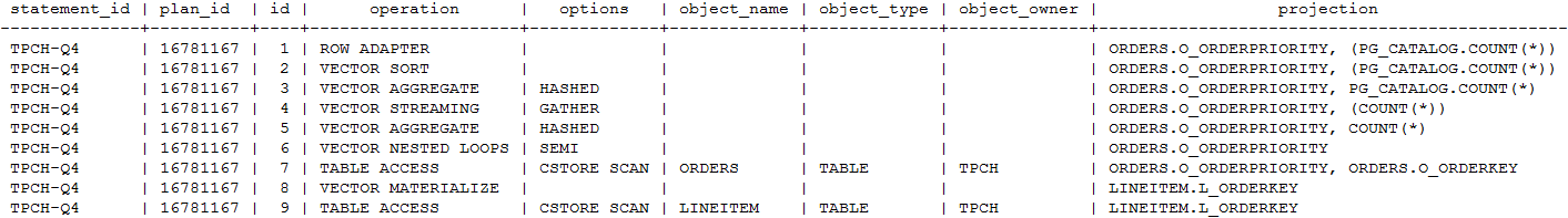 explain plan set statement_id='TPCH-Q4' for select o_orderpriority, count(*) as order_count from orders where o_orderdate >= '1993-07-01'::date and o_orderdate < '1993-07-01'::date + interval '3 month' and exists ( select * from lineitem where l_orderkey = o_orderkey and l_commitdate < l_receiptdate ) group by o_orderpriority order by o_orderpriority;