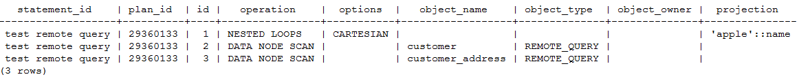 1 2 3 | EXPLAIN PLAN [ SET STATEMENT_ID = string ] FOR statement ; |