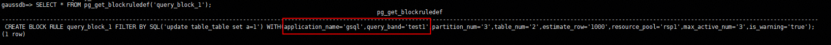 1 2 3 4 5 6 7 8 9 10 11 12 13 14 | CREATE BLOCK RULE query_block_1 FILTER BY SQL('update table_table set a=1') WITH (application_name='gsql', query_band='test1'); ALTER BLOCK RULE query_block_1 FILTER BY SQL('update table_table set a=1') WITH ( table_num='2', partition_num='3', estimate_row='1000', resource_pool='rsp1', max_active_num='3', is_warning='off' ); SELECT * FROM pg_get_blockruledef('query_block_1'); |