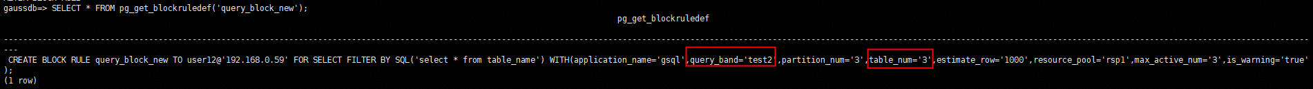 1 2 3 4 5 6 7 8 9 10 | ALTER BLOCK RULE query_block_new TO user12@'192.168.0.59' FOR SELECT FILTER BY SQL('select * from table_name') WITH ( query_band='test2', table_num='3'); SELECT * FROM pg_get_blockruledef('query_block_new'); |