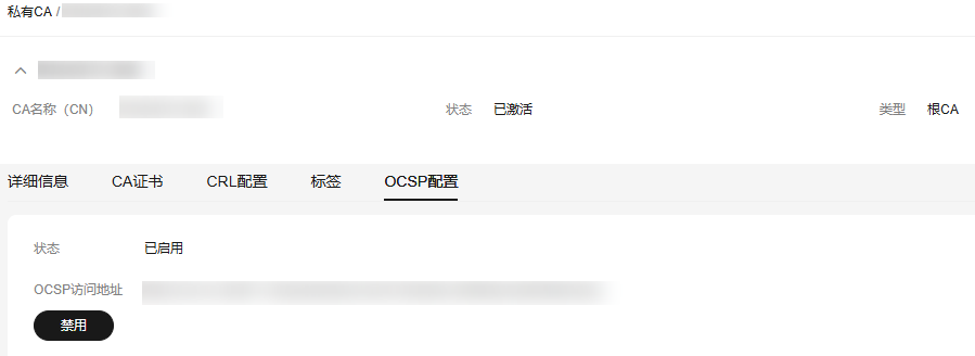 - 启用OCSP:私有CA启用OCSP时,使用该私有CA签发的私有证书扩展项中包含OCSP访问地址。