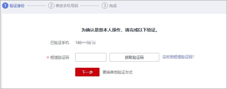 - 单击“获取验证码”,获取并输入短信验证码,单击“下一步”。