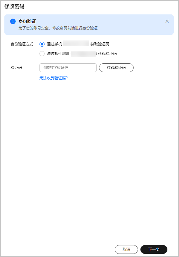 - 选择身份验证方式,获取验证码并输入,单击“下一步”。