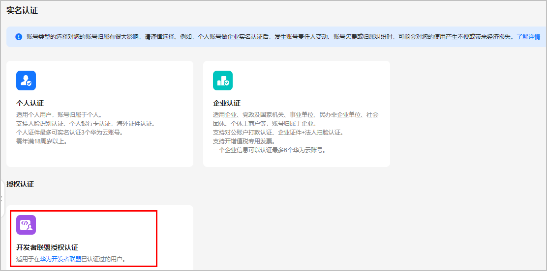 如果提示“您在开发者联盟未实名认证,请选择其它认证方式。”,表示无法使用开发者联盟授权认证,请使用个人实名认证或企业实名认证。