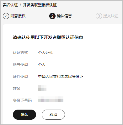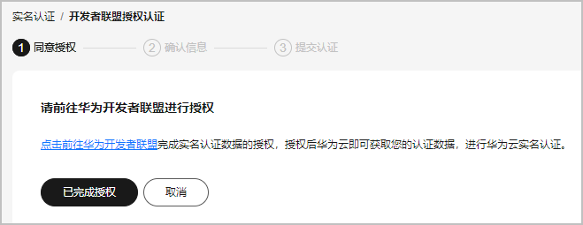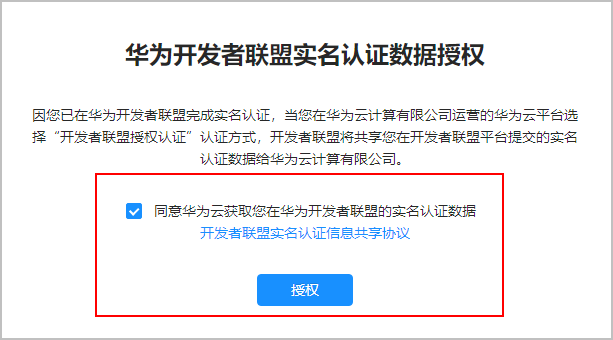 - 勾选“同意华为云获取您在华为开发者联盟的实名认证数据”,单击“授权”。