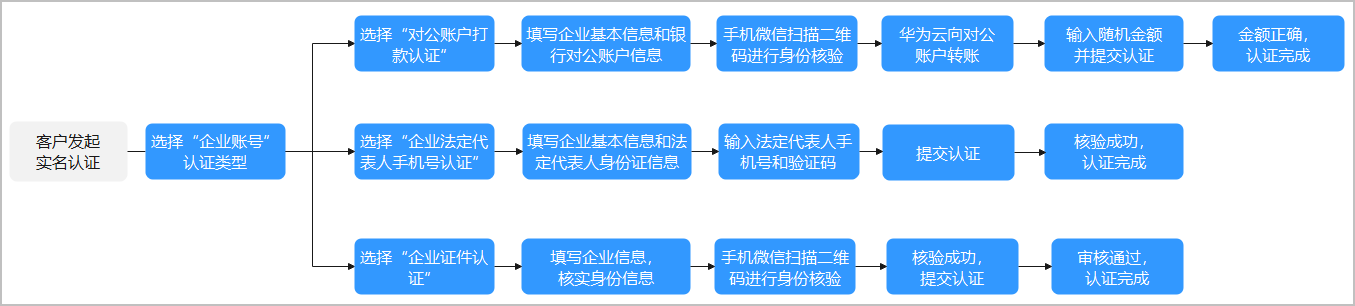 企业账号实名认证分为对公账户打款认证、企业法定代表人手机号认证和企业证件认证三种方式,总体流程如下: