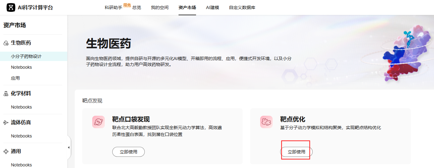 - 在“资产市场 > 小分子药物设计”页面,单击“靶点优化”功能卡片的“立即使用”。