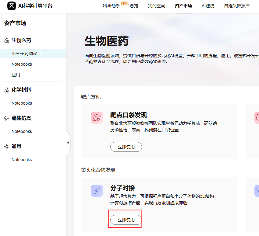 - 在“资产市场 > 小分子药物设计”页面,单击“分子对接”功能卡片的“立即使用”。