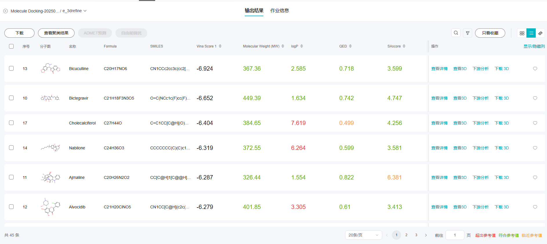 单击“查看详情”可以直观查看小分子的结合能和属性信息。