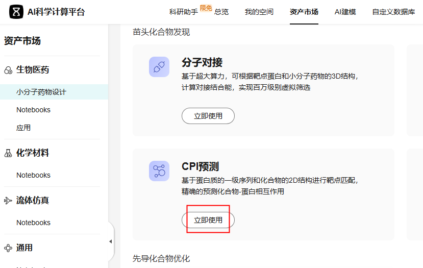 - 在“资产市场 > 小分子药物设计”页面,单击“CPI预测”功能卡片的“立即使用”。