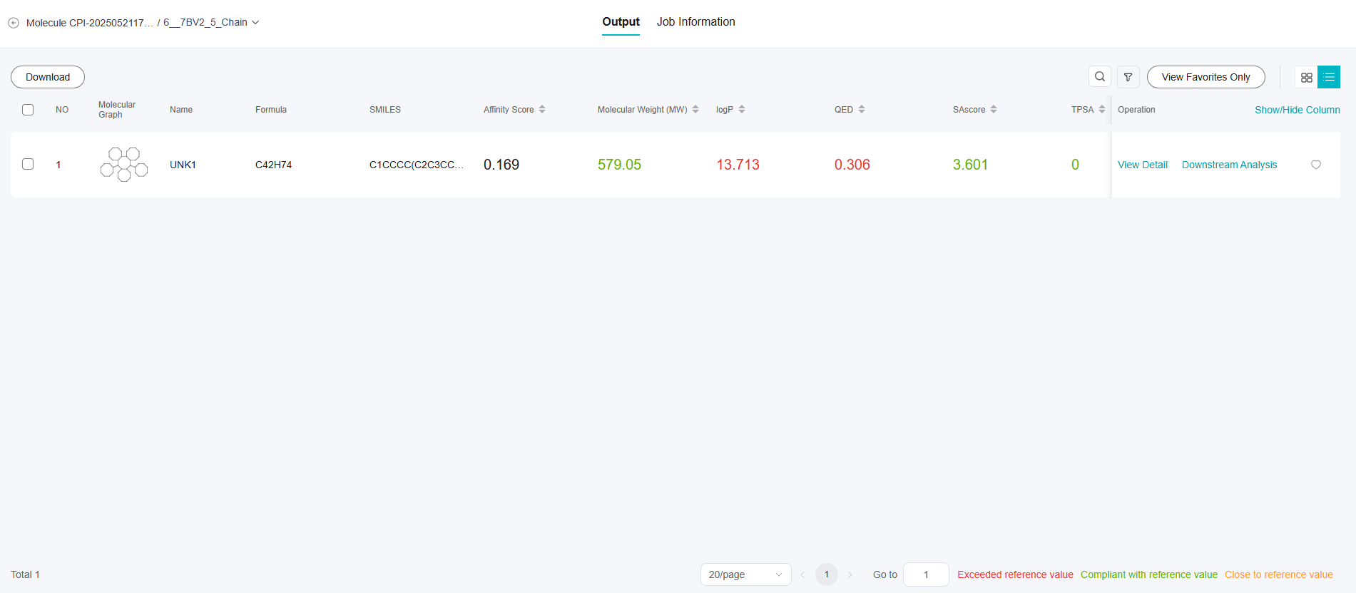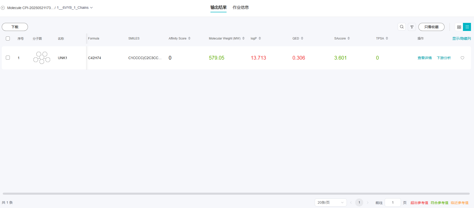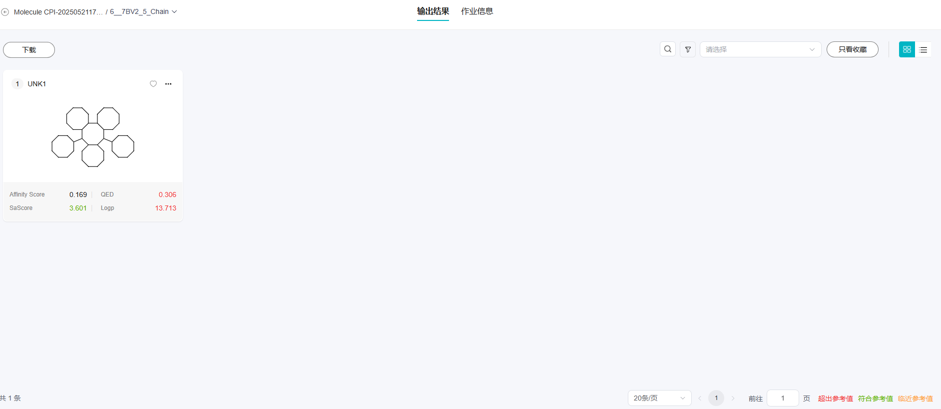 单个受体对多个配体的结果页面有列表视图、卡片视图,支持搜索、高级筛选,排序等功能。每个小分子支持“查看详情”可以进入小分子的属性详情页;支持“下游分析”,可以进行分子属性预测、分子搜索、分子优化。支持收藏功能,单击