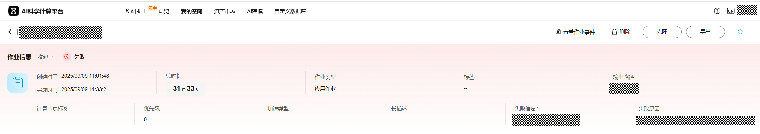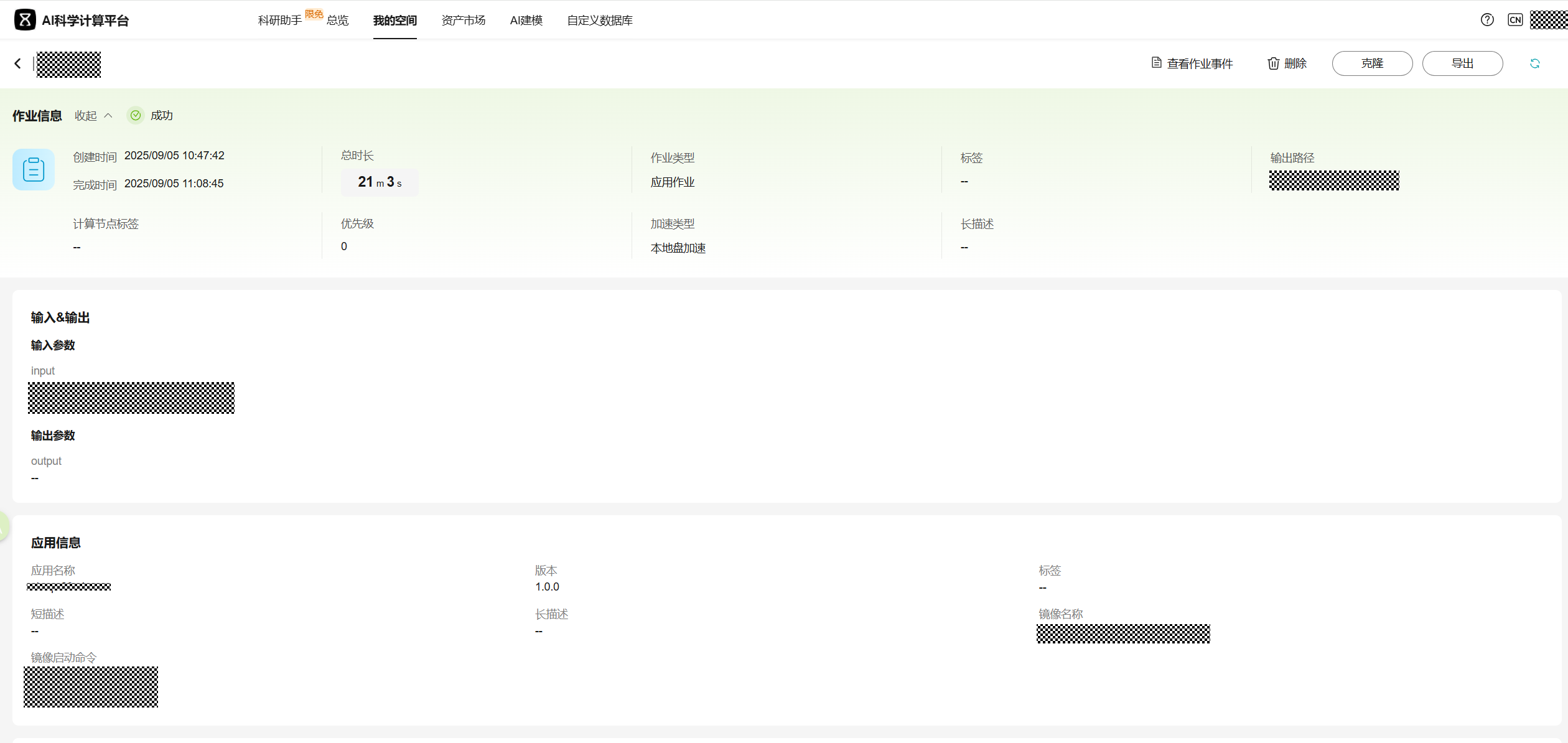 您可以通过单击作业名称,进入详情页面,查看详细的运行信息。包括运行状态、标签、描述、创建时间、完成时间、总时长、运行时长、计算节点标签、加速类型、优先级等。在参数配置下的应用信息栏中可以查看作业的输入&输出、节点参数、应用;在作业的子任务中可以查看日志、事件;在事件页签,可以查看实例的事件详情、下载YAML文件、查看监控。如果并发执行了多个作业,则会产生多个子任务。