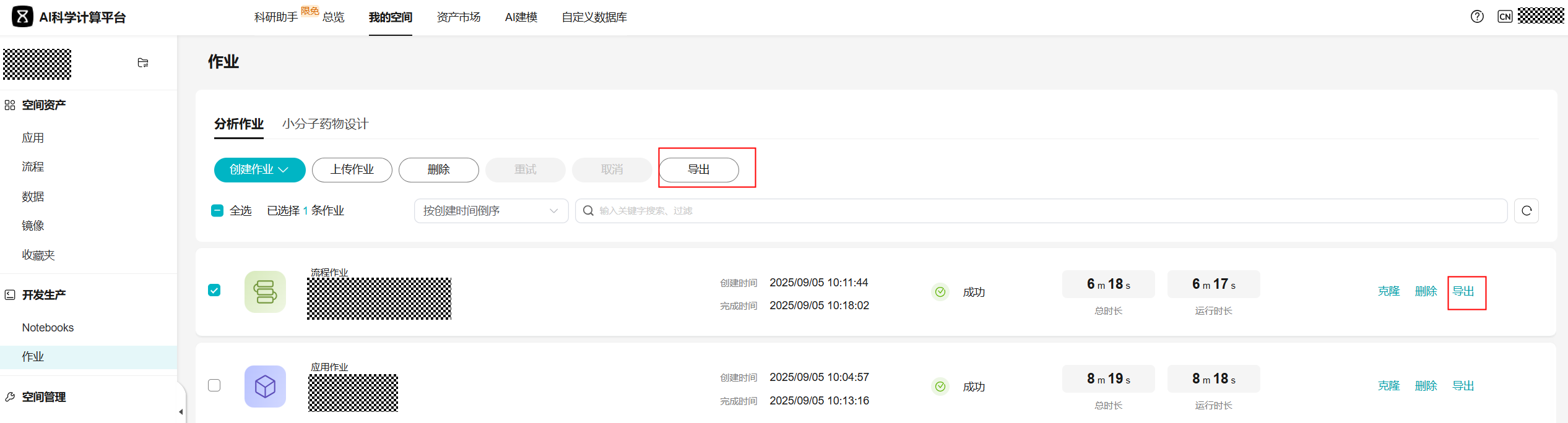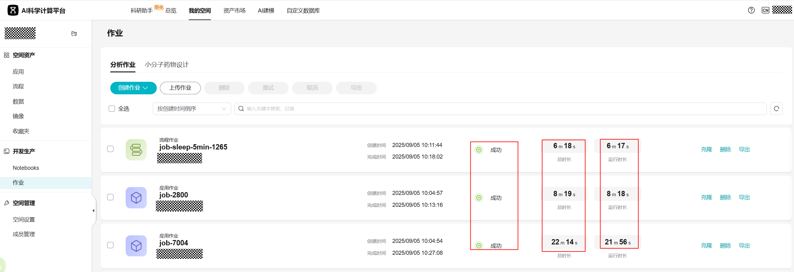 分析作业的执行时间与环境资源类型、环境资源大小、处理数据大小等相关。您可以在“作业”页面查看执行结果或进行操作。平台支持对作业的执行状态进行查看,并可对作业执行取消、删除、重试、克隆、导出操作。勾选多个作业,可以批量取消、批量删除、批量重试、批量导出。