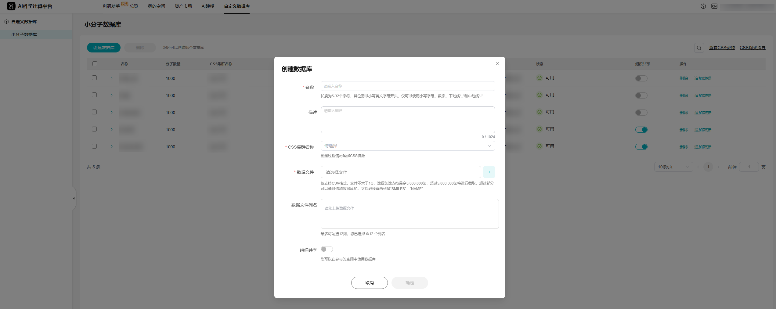 AI科学计算平台支持用户自定义数据库,可以上传自己的数据构建自己的数据库,进行后续的分子搜索。构建自定义数据库需要先购买CSS资源和绑定CSS资源,详情见CSS资源。